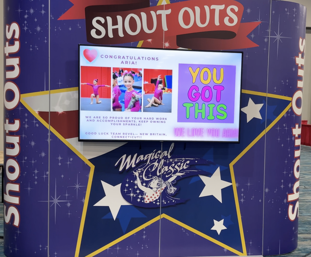 Your message will appear on our custom ShoutOut Wall right at the entrance of the competition — a magical way for gymnasts to feel celebrated the moment they walk in.